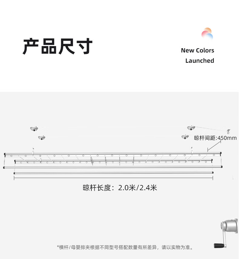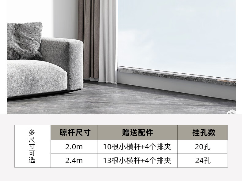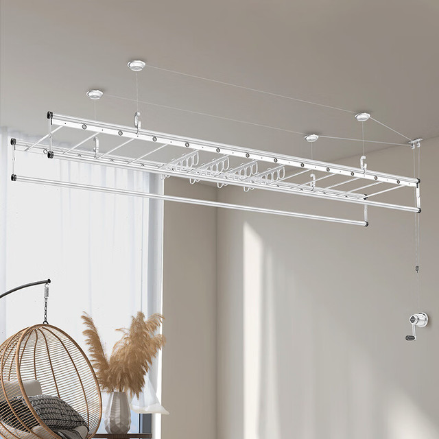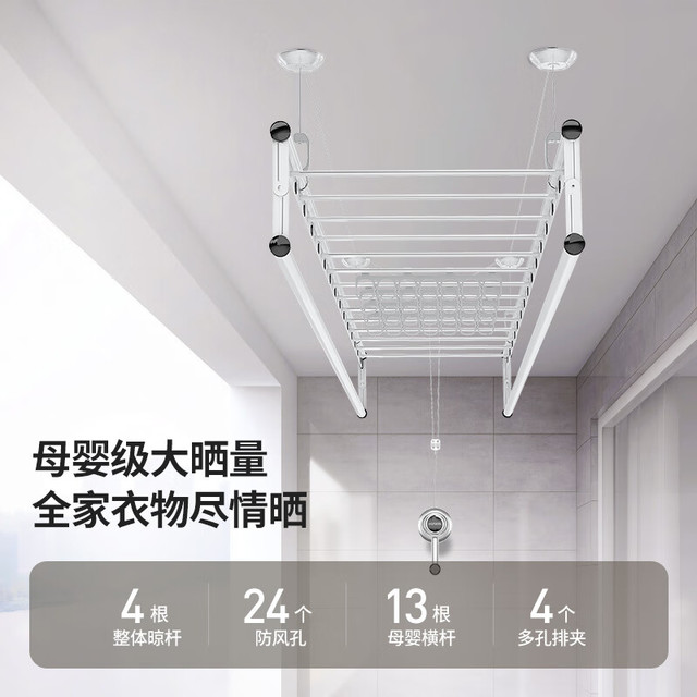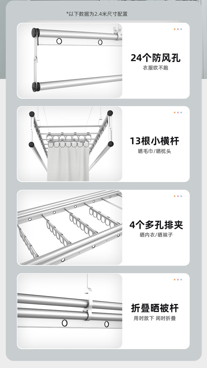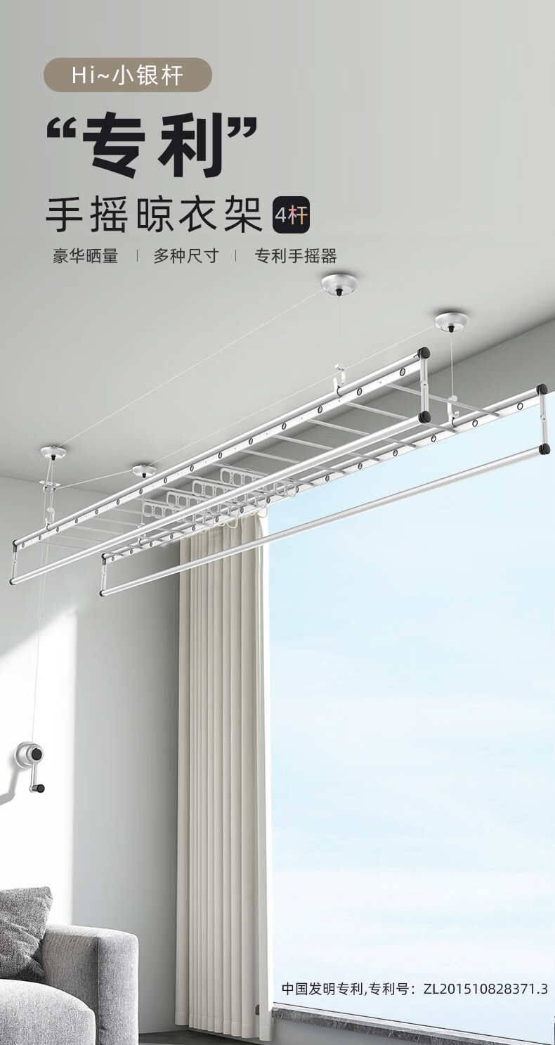 HOTATA好太太D-1123手摇晾衣架,银色款,以2.4米长四杆设计,提供宽敞晾晒空间。采用铝合金材质,具备24个圆孔和13根小横杆,增强防风性和多功能晾晒能力。防反转手摇器操作简便,单边杆承重达10kg,确保稳固耐用。银色喷漆涂层结合高温氧化处理,耐腐蚀且适配多种家装风格,是家居晾晒的理想选择。