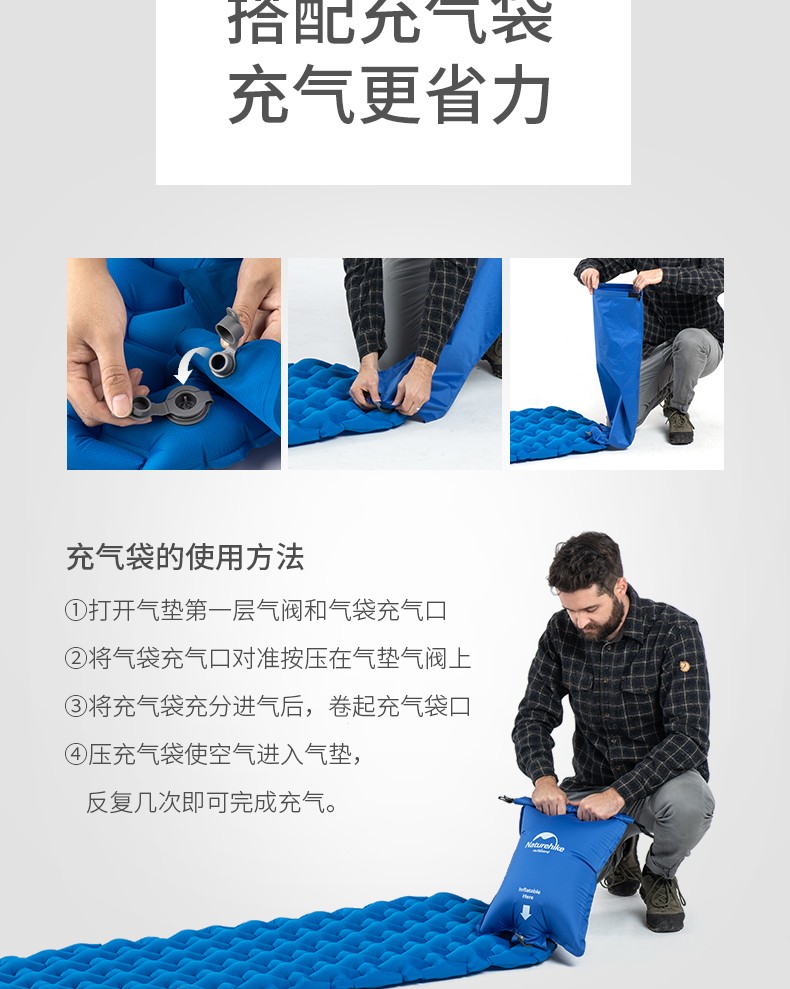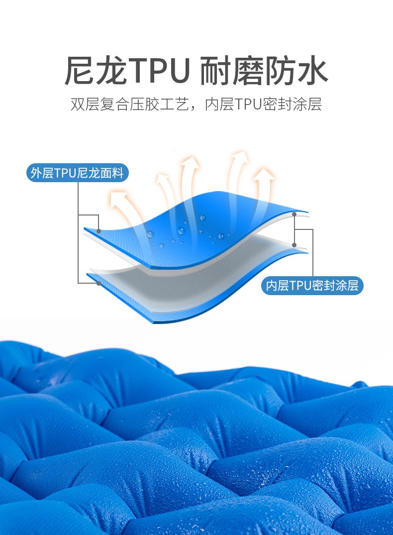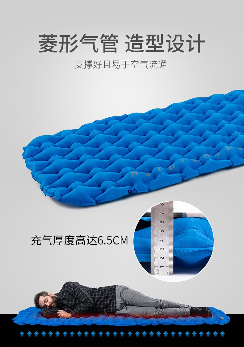 NatureHike 挪客 6927595734261 气袋式户外充气垫,采用菱形气管造型设计,分散压力,柔软支撑,卧躺更舒适,充气厚度高达6.5cm。