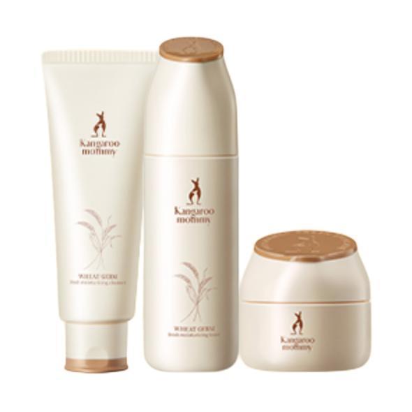 袋鼠妈妈于2016年自主研发的全新系列,功效定位是呵护。此款护肤套装含滋养保湿洁面乳100g、滋养保湿柔肤水150ml,全日美肌保湿乳150g,采用小麦胚芽成分,经典三步,天然呵护,清浊净化,促进内在锁水力,提升肌肤含水量,改善肌底,打造孕期水润弹嫩肌肤。