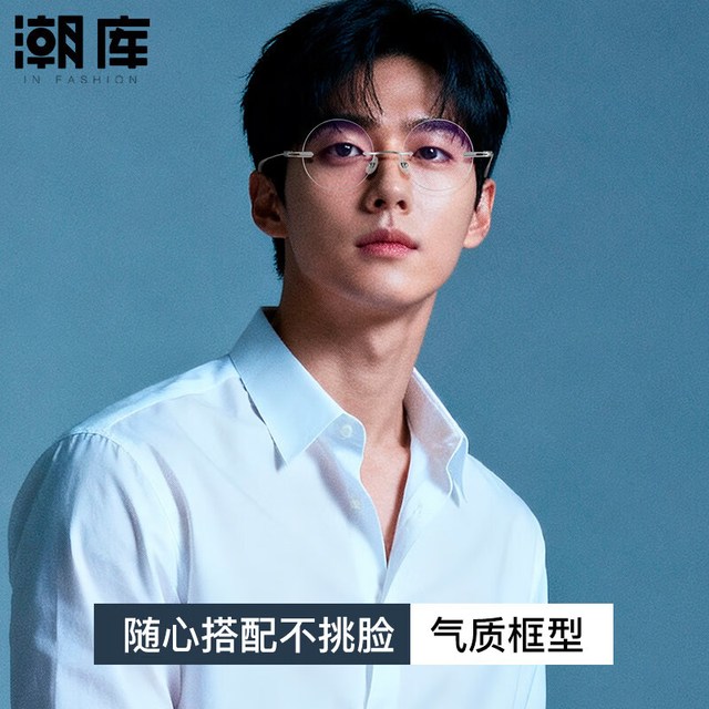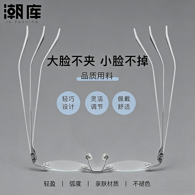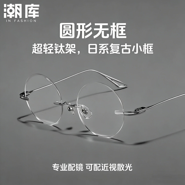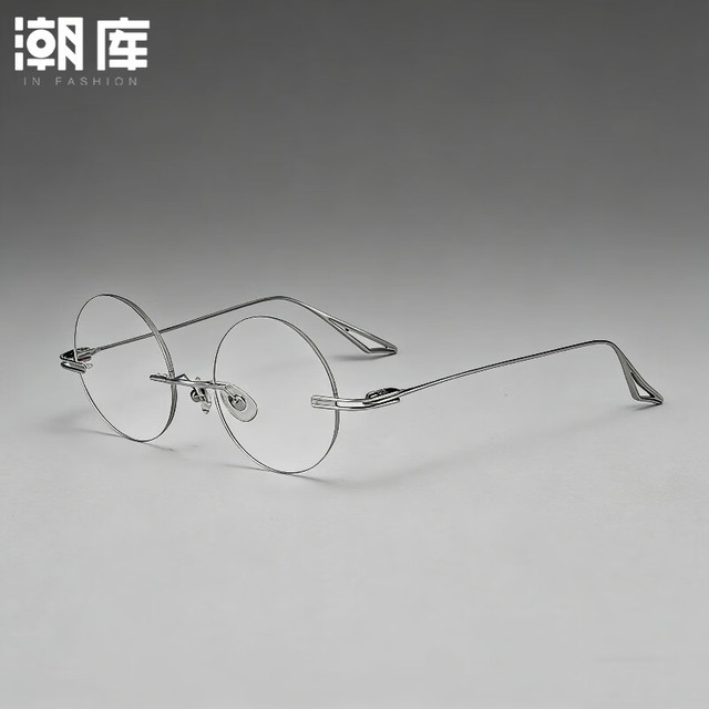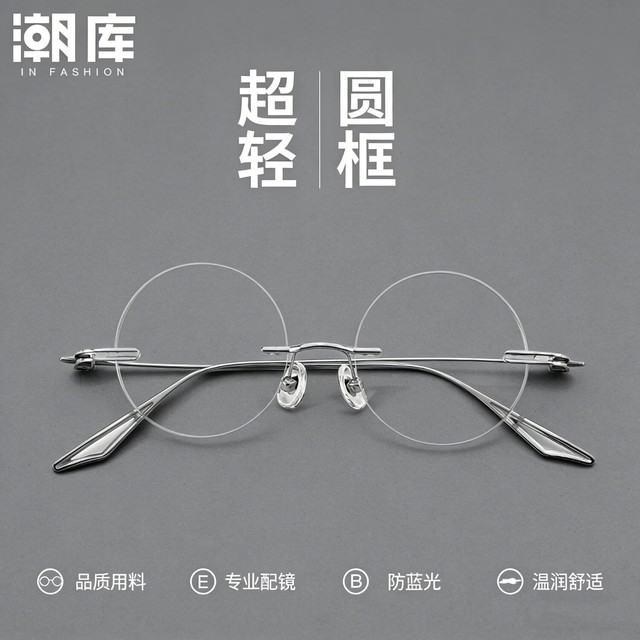 潮库超轻钛圆形无边框近视眼镜框男款可配度数复古小圆框防蓝光镜女 圆形YT99221银色 配1.67防蓝光300-800度