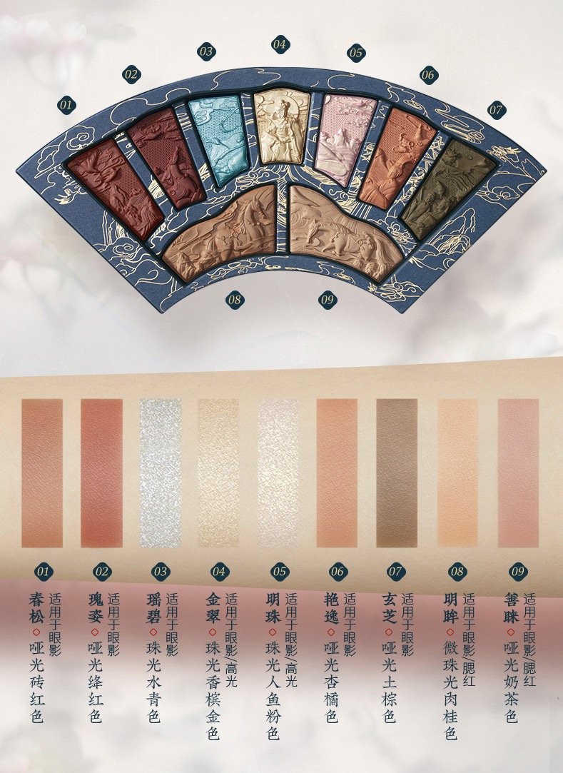 这款9色彩颊盘,色彩搭配上:珠光、哑光、基础、过渡、晕染、提亮、修容色一应俱全;除了眼影之外亦可做腮红、高光、修容等,一盘多用,打造一个精致的全脸整妆,没什么负担。另外,盘中兼备冷、暖色系,无论是春夏朝气妆、秋冬深邃妆,都可设计与搭配~可以说以一款性价比很高的彩妆盘了