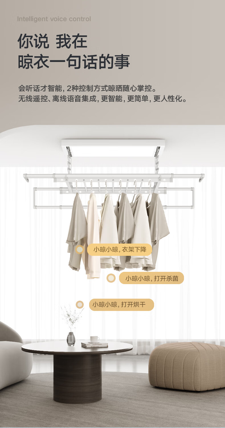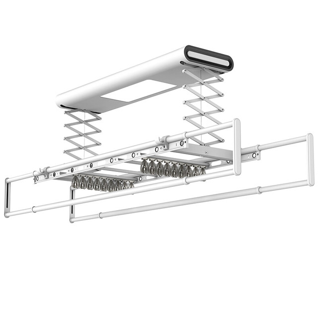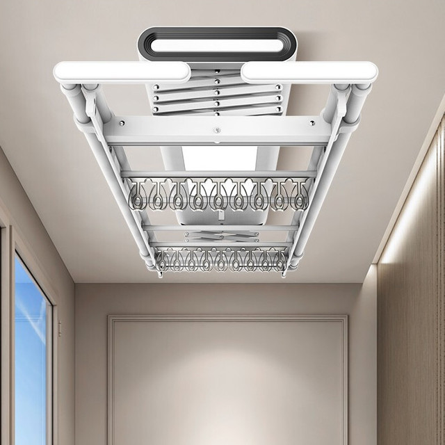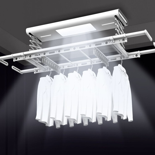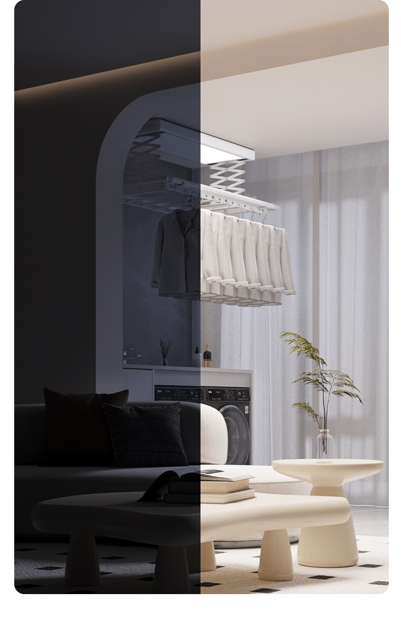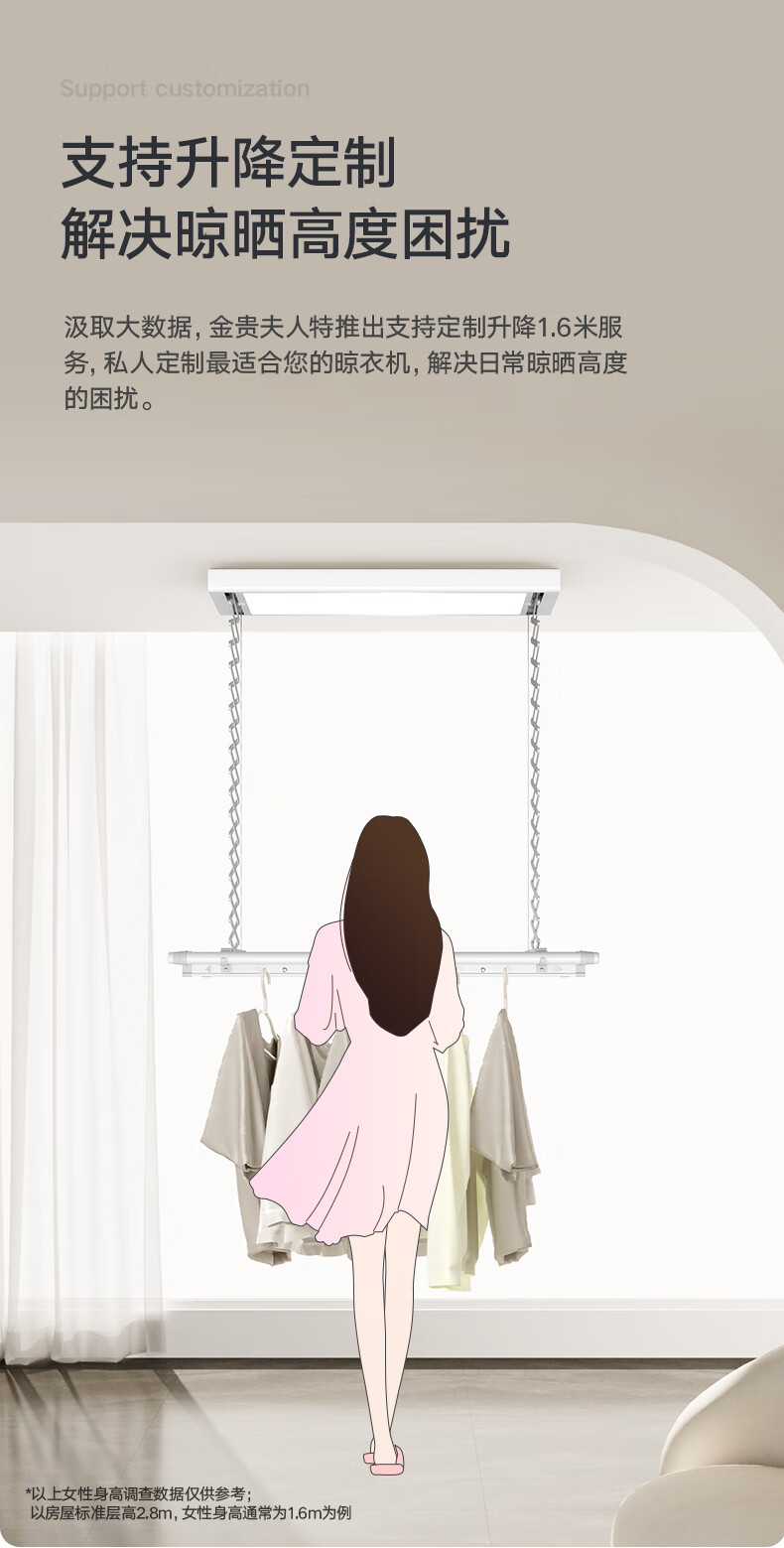 金贵夫人 电动晾衣架 选材环保,制作精细,一键升降,UV杀菌,承重能力强,升级多功能大量晒,4根晾衣杆+26个挂孔+2根晾晒横杄+2组母婴夹。LED大面屏照亮阳台、低耗能晚间晾晒也够亮。双侧强力消毒灯,UV智能母婴级杀菌,30min定时设置,99.99%有效除螨、细菌、病毒等微生物。遇阻即停,优选直流电机具有低噪音运行、过压、过载、过热等保护功能。采用第八代智能芯片,安全晾衣,智享生活,体验晾晒黑科技。智能采集环境信息与数据,主动监测环境分析环境变化,自动开启或关闭相应程序,健康护衣,智能定时程序,省心省力。