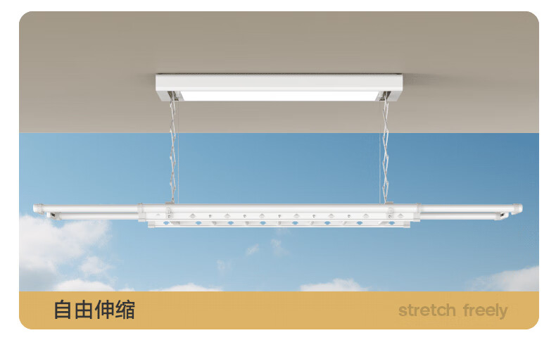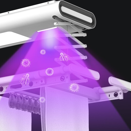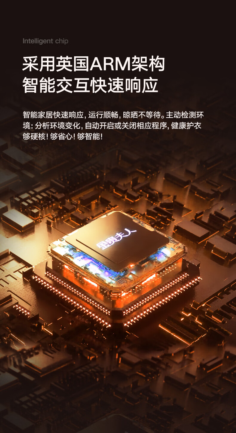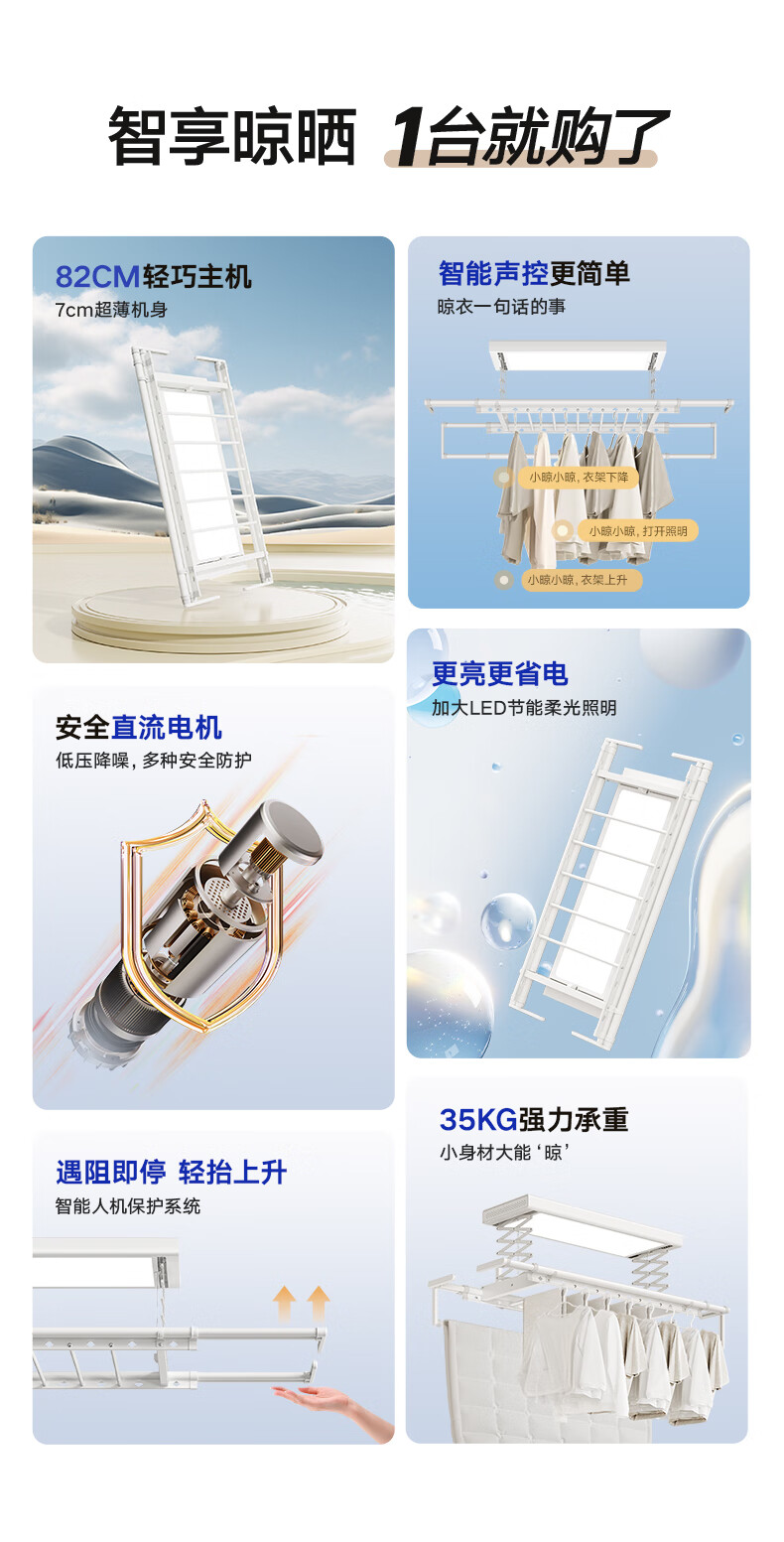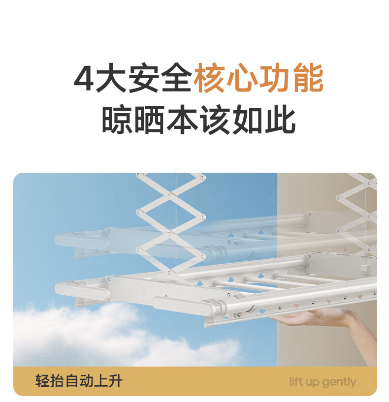金贵夫人 电动晾衣架 选材环保,制作精细,一键升降,UV杀菌,承重能力强,升级多功能大量晒,4根晾衣杆+26个挂孔+2根晾晒横杄+2组母婴夹。LED大面屏照亮阳台、低耗能晚间晾晒也够亮。双侧强力消毒灯,UV智能母婴级杀菌,30min定时设置,99.99%有效除螨、细菌、病毒等微生物。遇阻即停,优选直流电机具有低噪音运行、过压、过载、过热等保护功能。采用第八代智能芯片,安全晾衣,智享生活,体验晾晒黑科技。智能采集环境信息与数据,主动监测环境分析环境变化,自动开启或关闭相应程序,健康护衣,智能定时程序,省心省力。