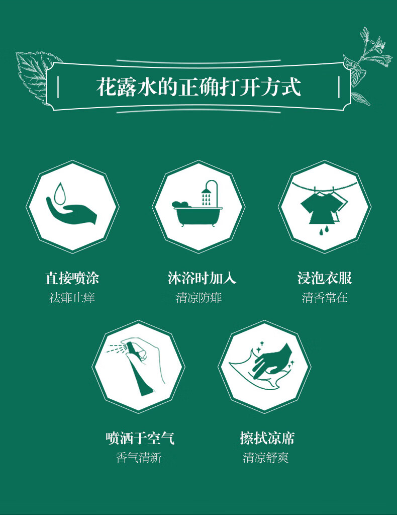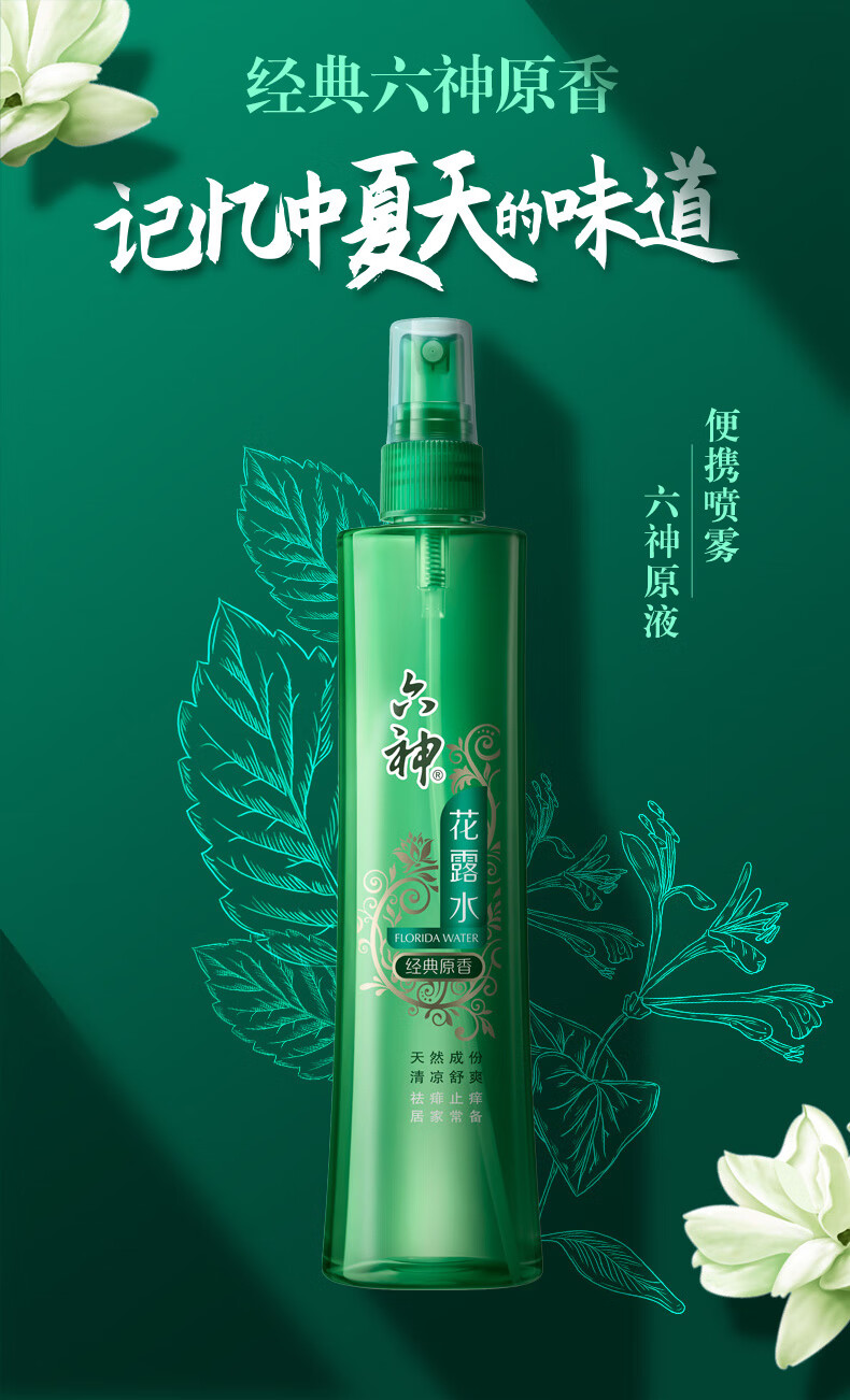 六神花露水,经典六神原香,便携喷雾。祛痱止痒,清凉法痱,缓解肌肤因蚊虫叮咬引起的奇痒。疲劳时涂于太阳穴,即感精神振奋。涂抹或加入浴水,舒爽怡人,乐享清凉。经典清香唤醒美好记忆,清新祛除异味。直接喷涂,浸泡衣服,喷洒于空气,擦拭凉席,清凉舒爽。
