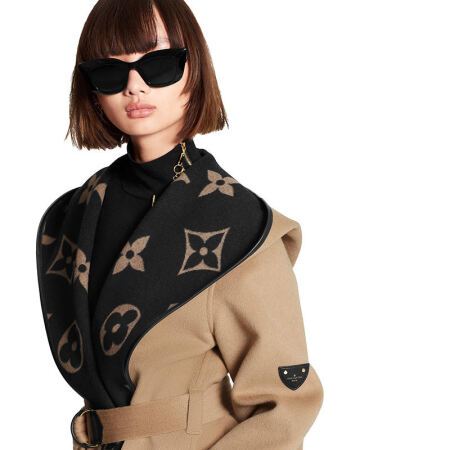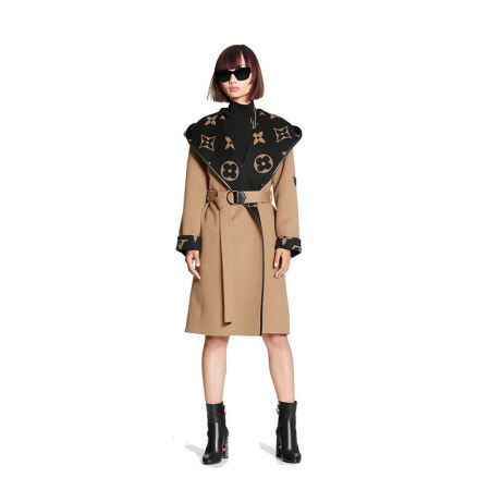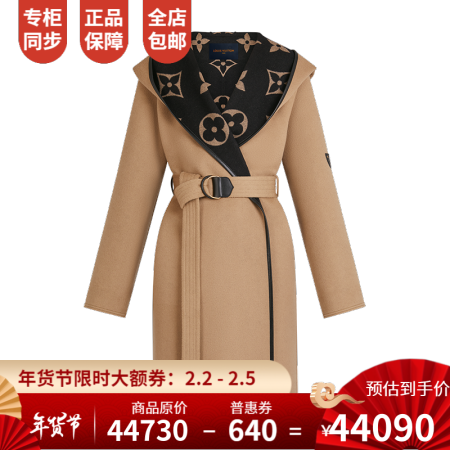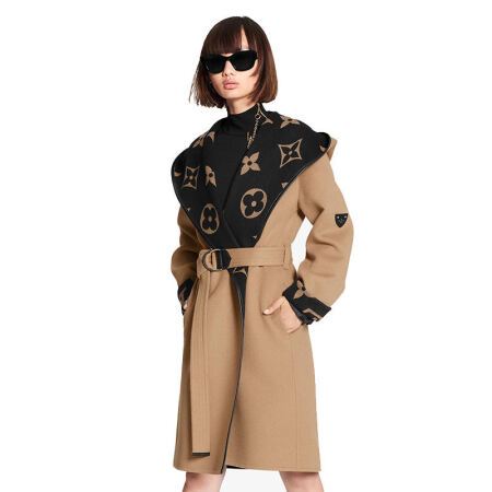 路易威登LV女装围裹式大衣翻领连帽双面丝毛混纺外套时尚保暖1A8KT 卡其色 36