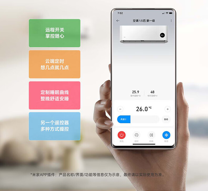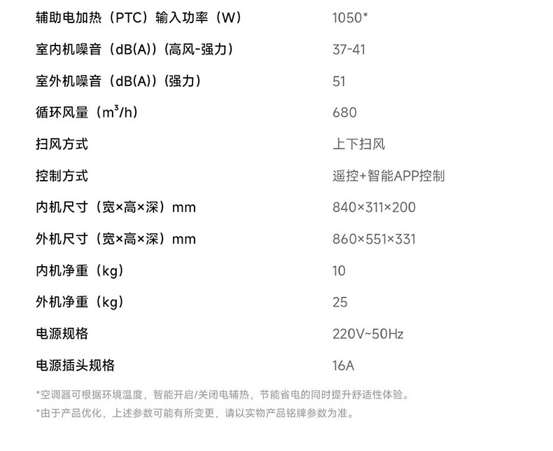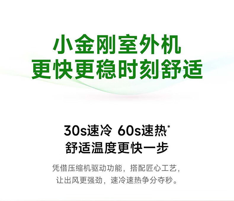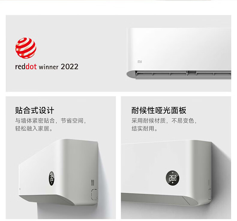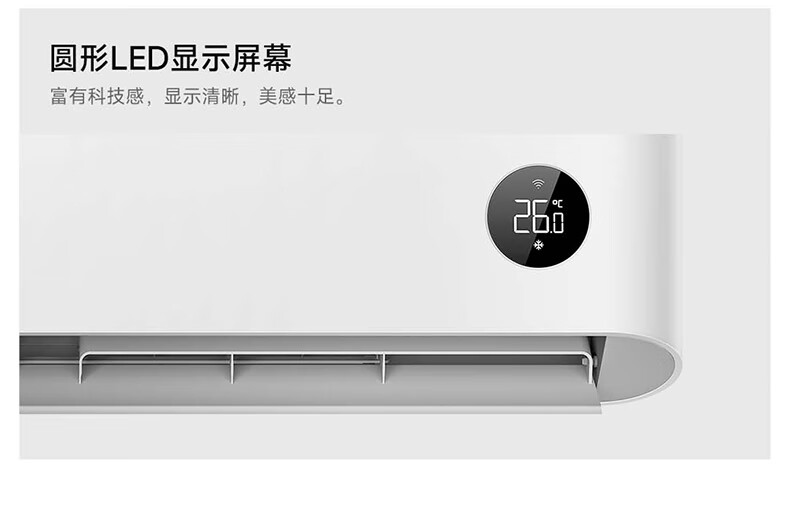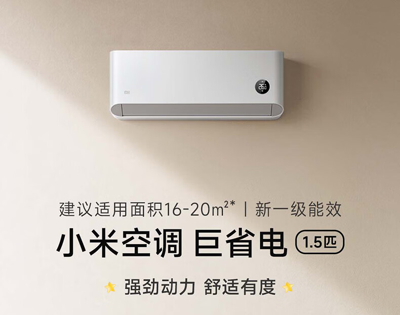 小米 巨省电系列 V1A1 新一级能效 壁挂式空调,采用全直流变频架构,冷媒为R32,APF能效比高达5.3,符合新一级能效标准。搭载风机转速自动补偿技术,实现极端环境正常制冷制热,能够支持-32℃~50℃宽温域运行。内外机都支持结霜凝露自清洁,内机利用空气能加热烘干,实现99%的除菌率。内置光敏观感器,检测到室内光线变化,可以自动调节亮度。可以接入米家APP,并与其他智能设备联动,包括用小爱语音控制。