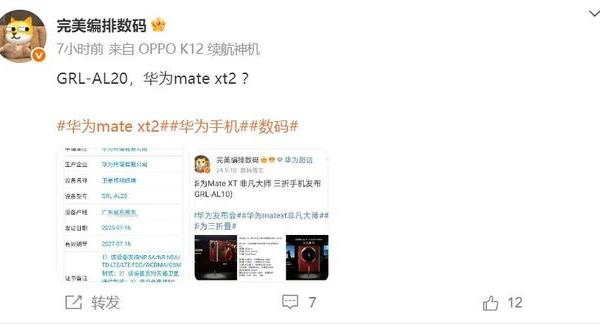华为新一代三折叠来了!Mate XT 2入网,将首发eSIM