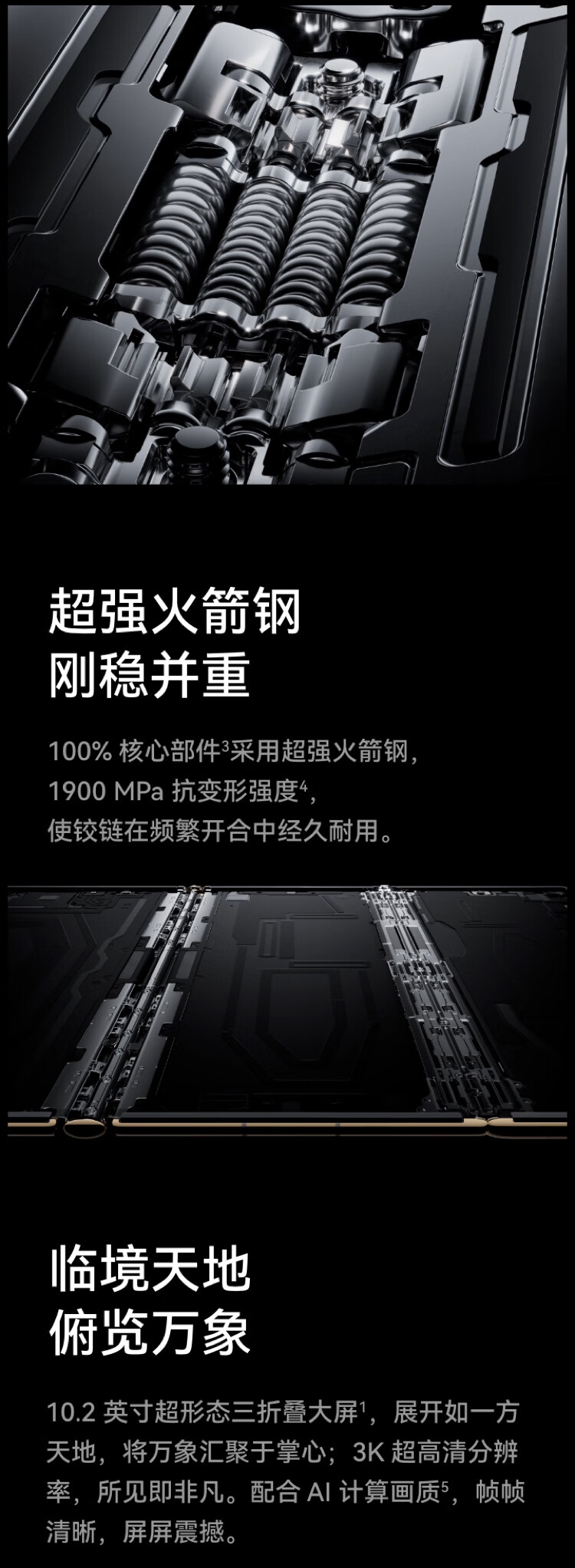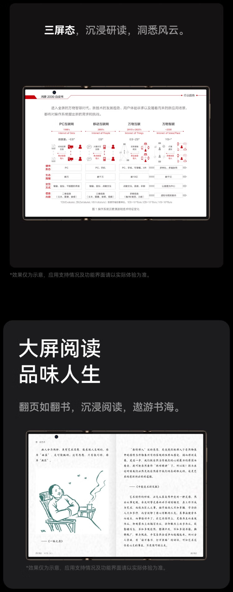 观点一独特的创新三折叠形态,展开后屏幕巨大且机身轻薄,兼顾便携与大屏办公体验。