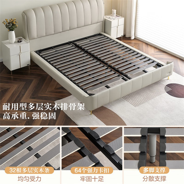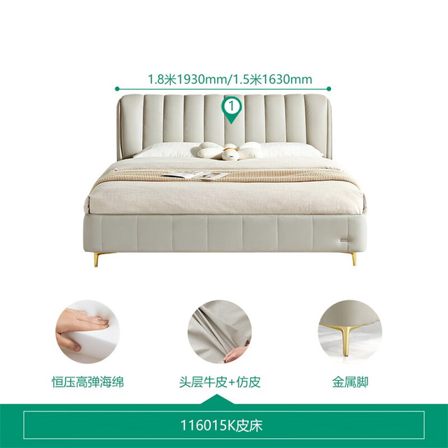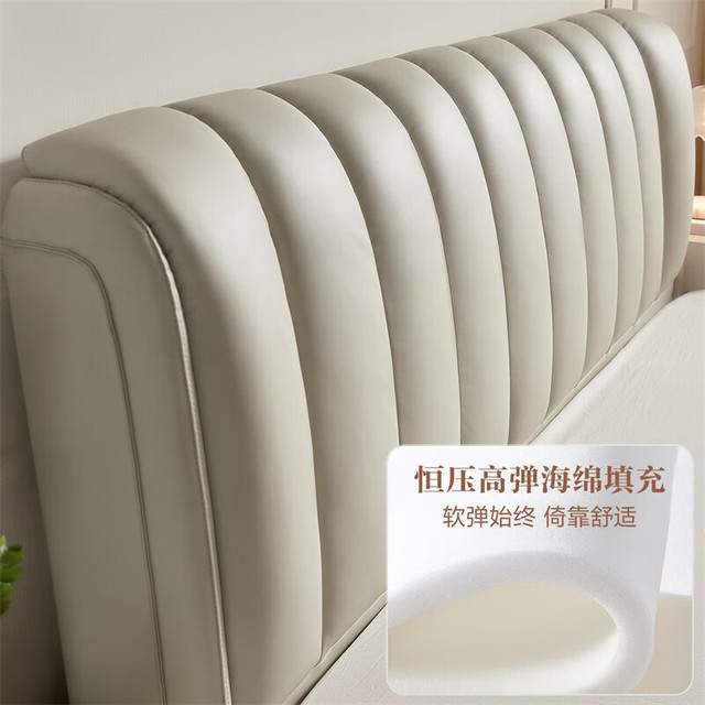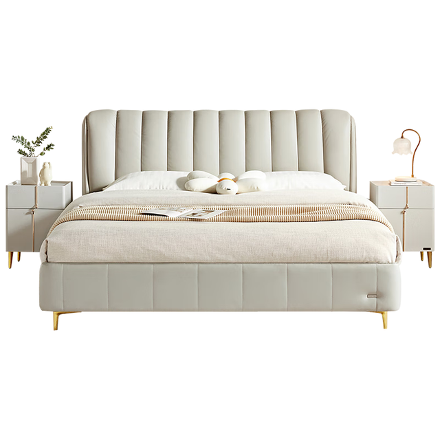 全友家居现代简约头层牛皮高箱储物主卧双人大床真皮软包高脚床 浅灰白|1.5M高脚床