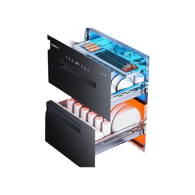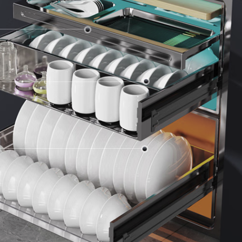 可在1H-12H之间选择消毒柜的预约时间随时进行消毒。一次可消毒77件餐具,满足3-8口家庭所需。一机满足消烘存放三大需求,搭配嵌入式设计为厨房腾出更多的可用空间。
