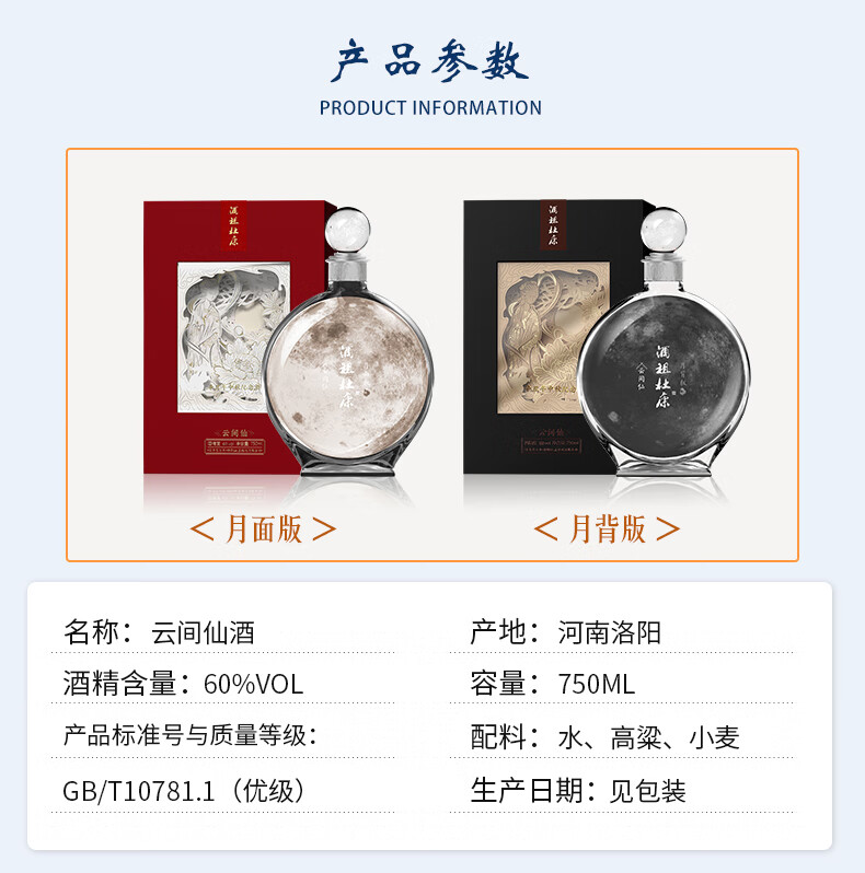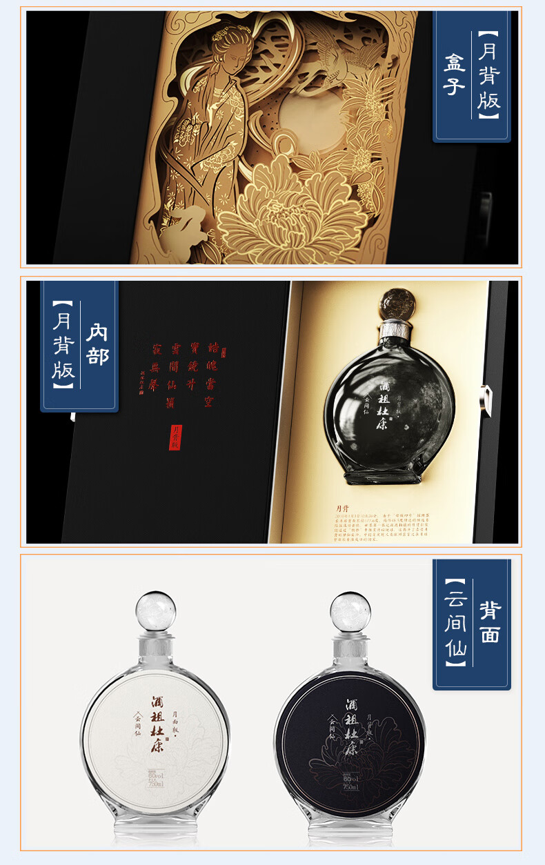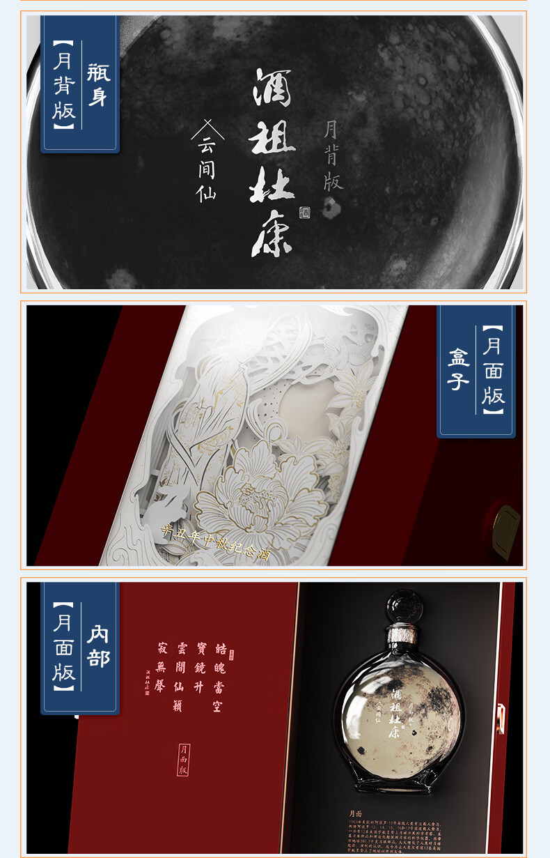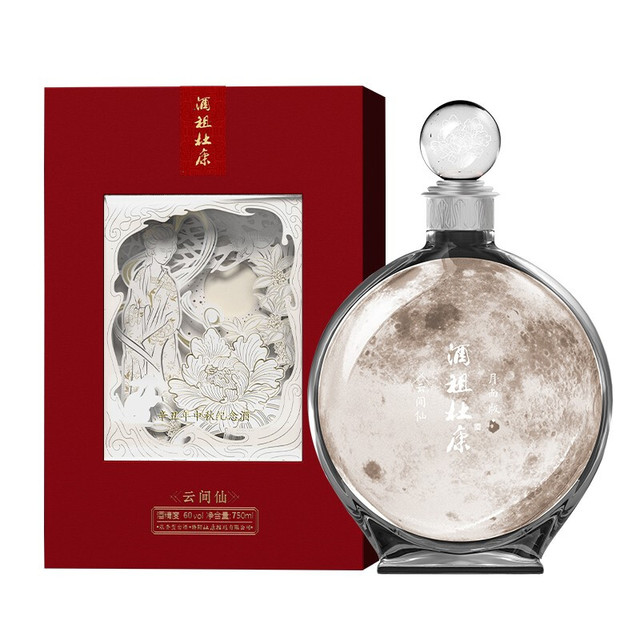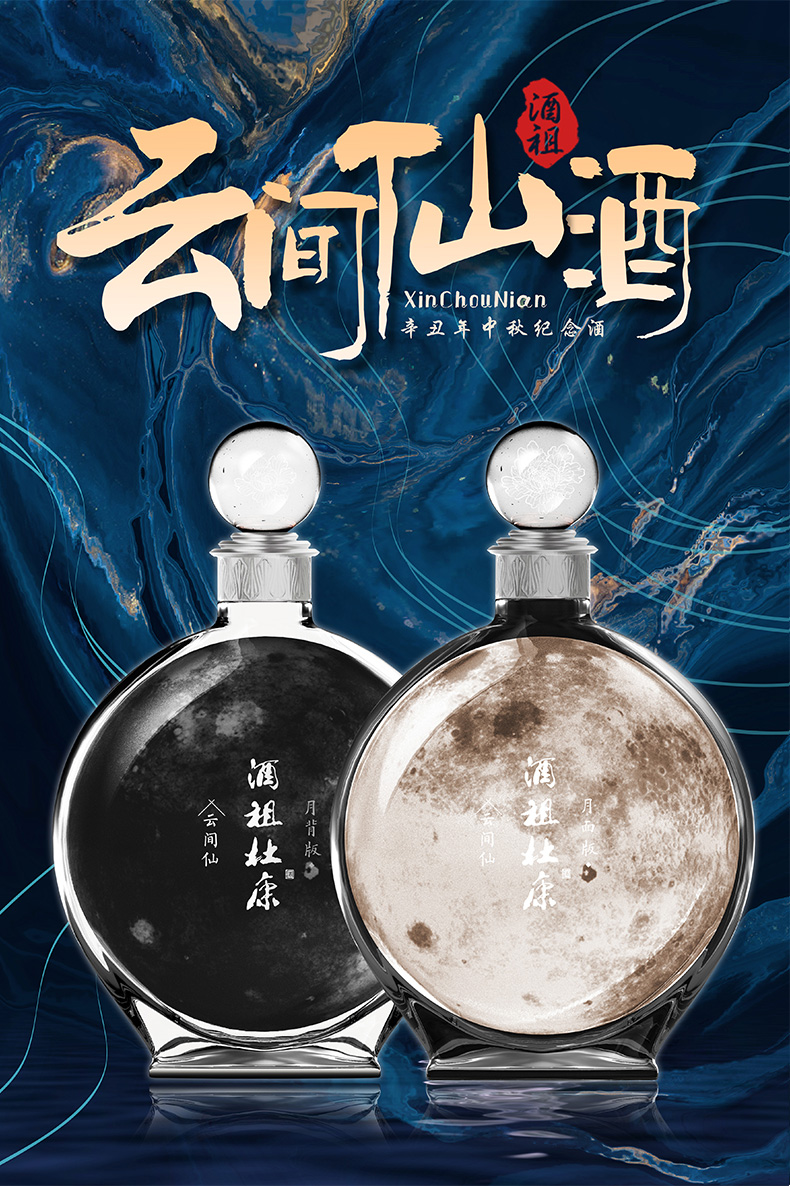 2021年,号称“中国文化酒名片”的“酒祖杜康”推出了两款高创意、高价值、高颜值的“登月纪念版”礼品酒——命名“云间仙·月面版”和“云间仙·月背版”。两款“登月纪念酒”的设计,与中国的高科技、登月飞天事件结合,立体呈现出了月亮的正面和背面,旨在致敬中国航天、祝福家国团圆。酒祖杜康云间仙辛丑年中秋纪念酒限量发售仅8150套,定位高端收藏、礼品馈赠。