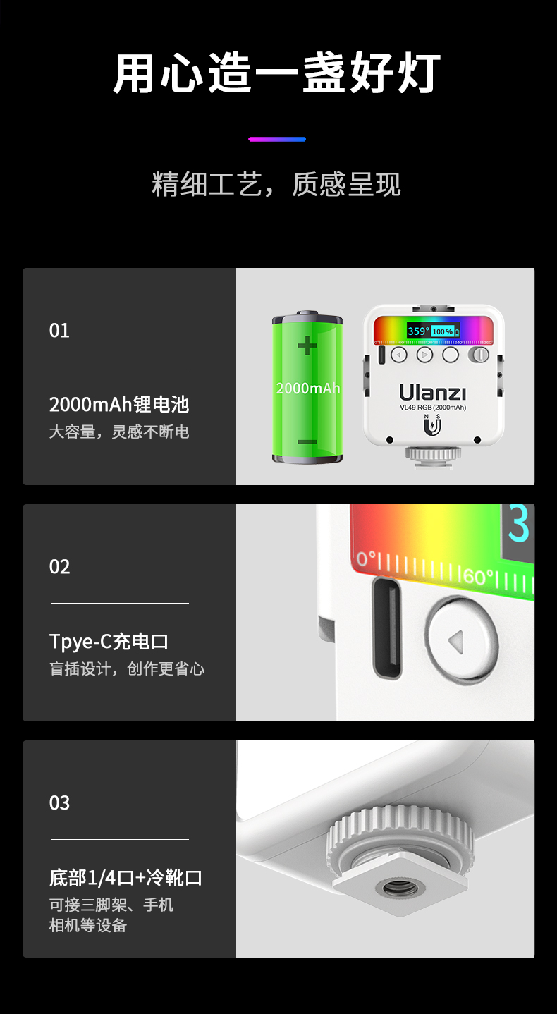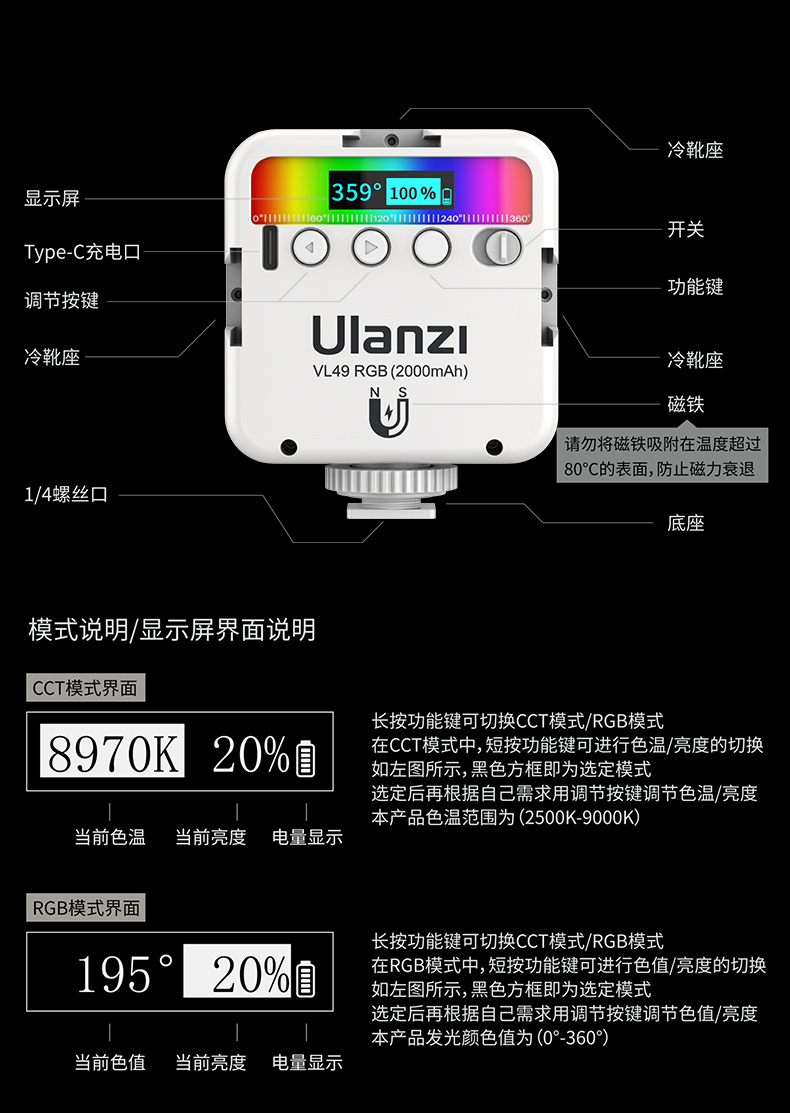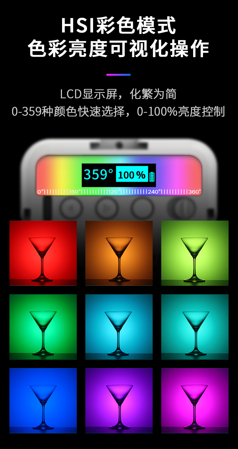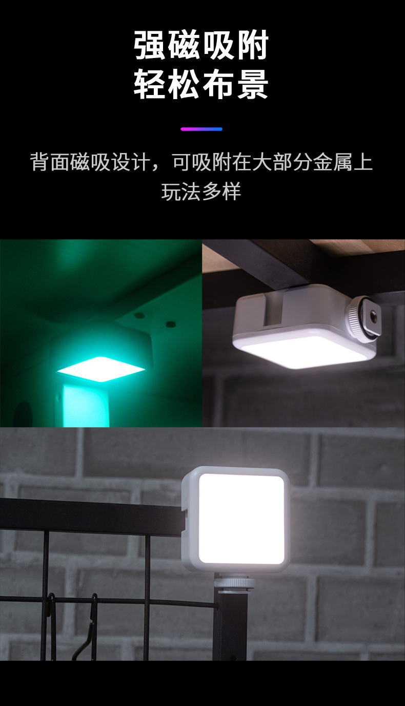 拥有LCD显示屏,359种颜色快速选择,0-100%亮度控制,3种灯光模式,2500-9000K色温,60颗高显色灯珠,光照角度120%,背面磁吸设计,可吸附在大部分金属上,3靴拓展,多兼容,2000mAh锂电池,Type-C充电口。