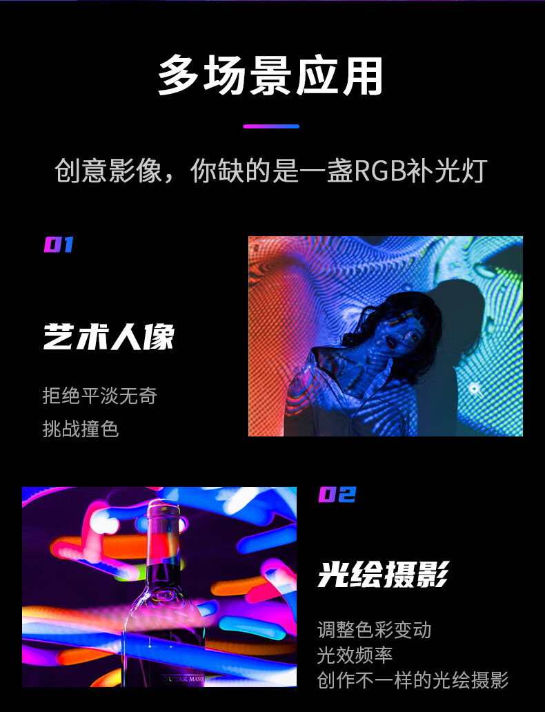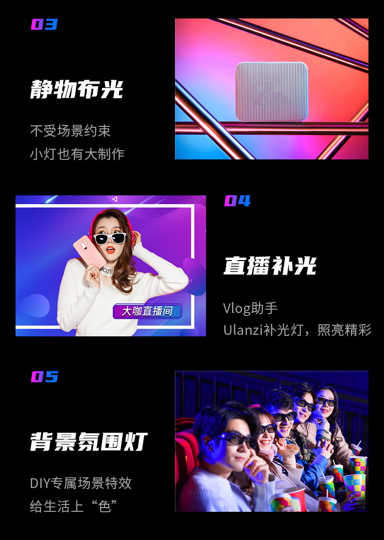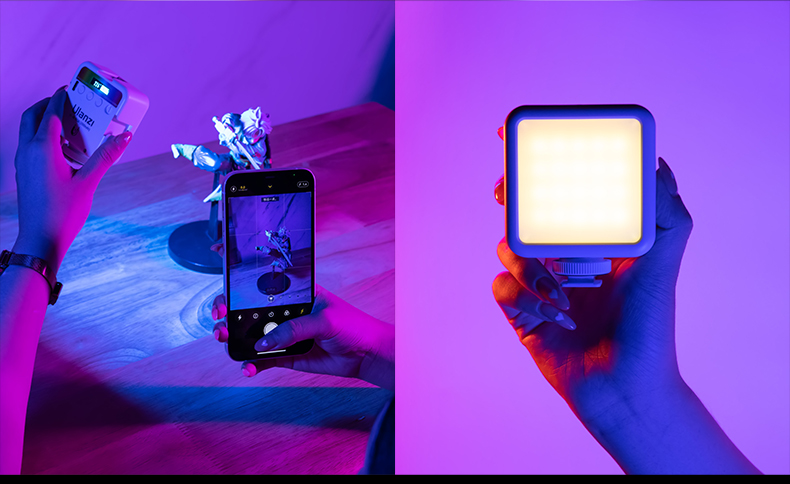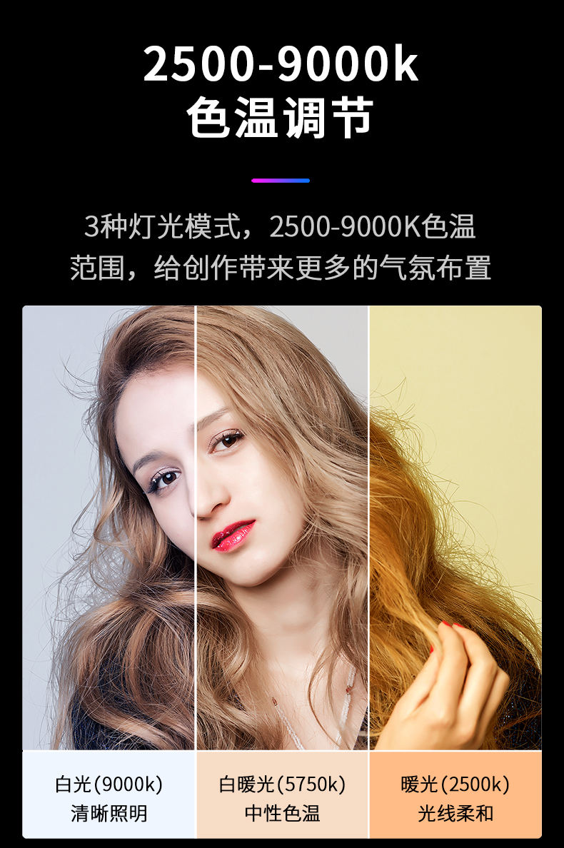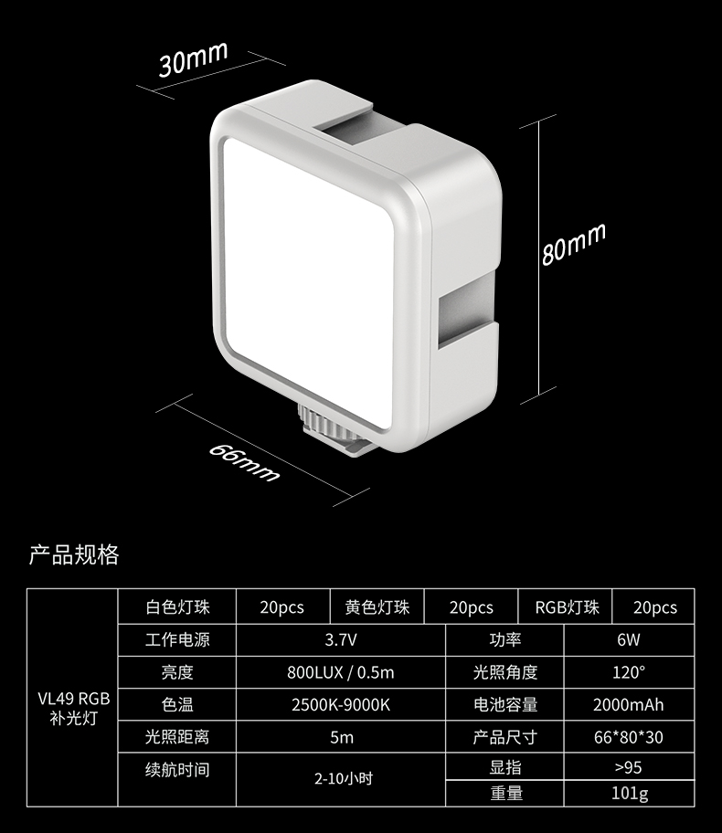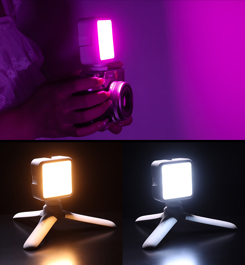 拥有LCD显示屏,359种颜色快速选择,0-100%亮度控制,3种灯光模式,2500-9000K色温,60颗高显色灯珠,光照角度120%,背面磁吸设计,可吸附在大部分金属上,3靴拓展,多兼容,2000mAh锂电池,Type-C充电口。