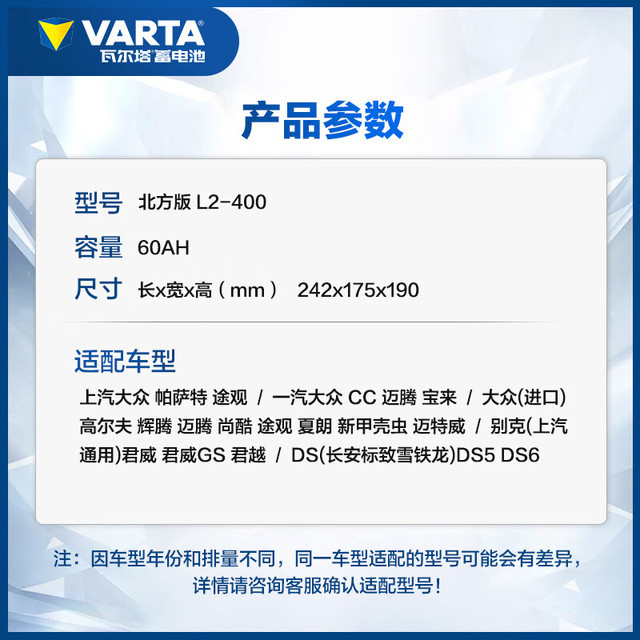 瓦尔塔(VARTA)汽车电瓶蓄电池 北方版 L2-400 上门安装