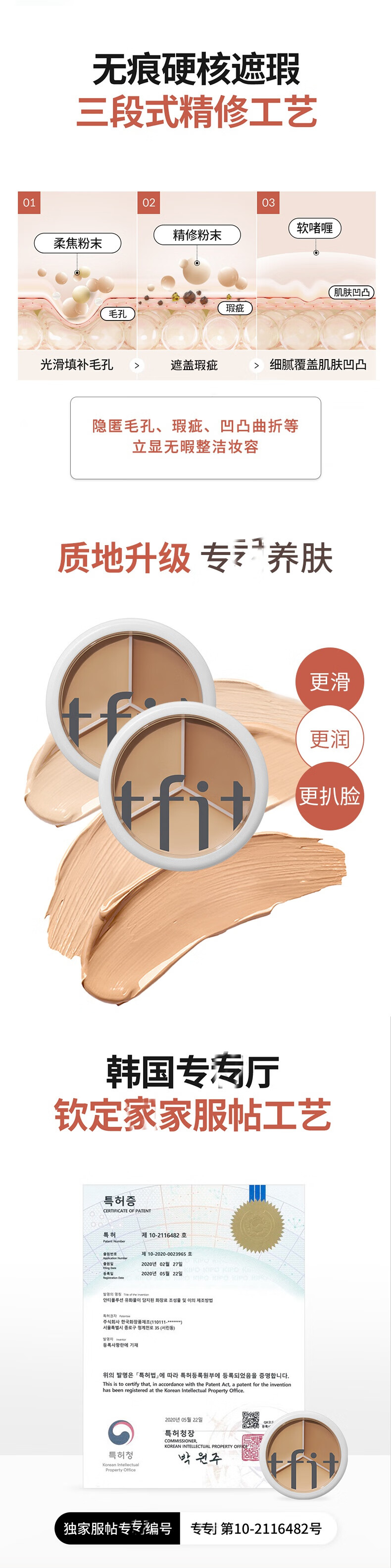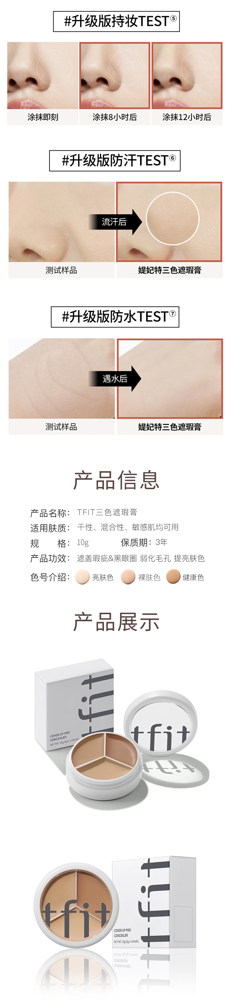 该商品主亚洲肤色而定,一盘3色,多色叠用。可长时间遮瑕,一抹柔焦。均匀肌肤,体力暗沉。不仅如此还润泽保湿,解决卡纹。还有着抑油分子,超越普通遮瑕料体,密集填补肌肤凹凸。长久控制油脂分泌,膏体细腻服帖与肌肤紧密结合,不易移位更加久。